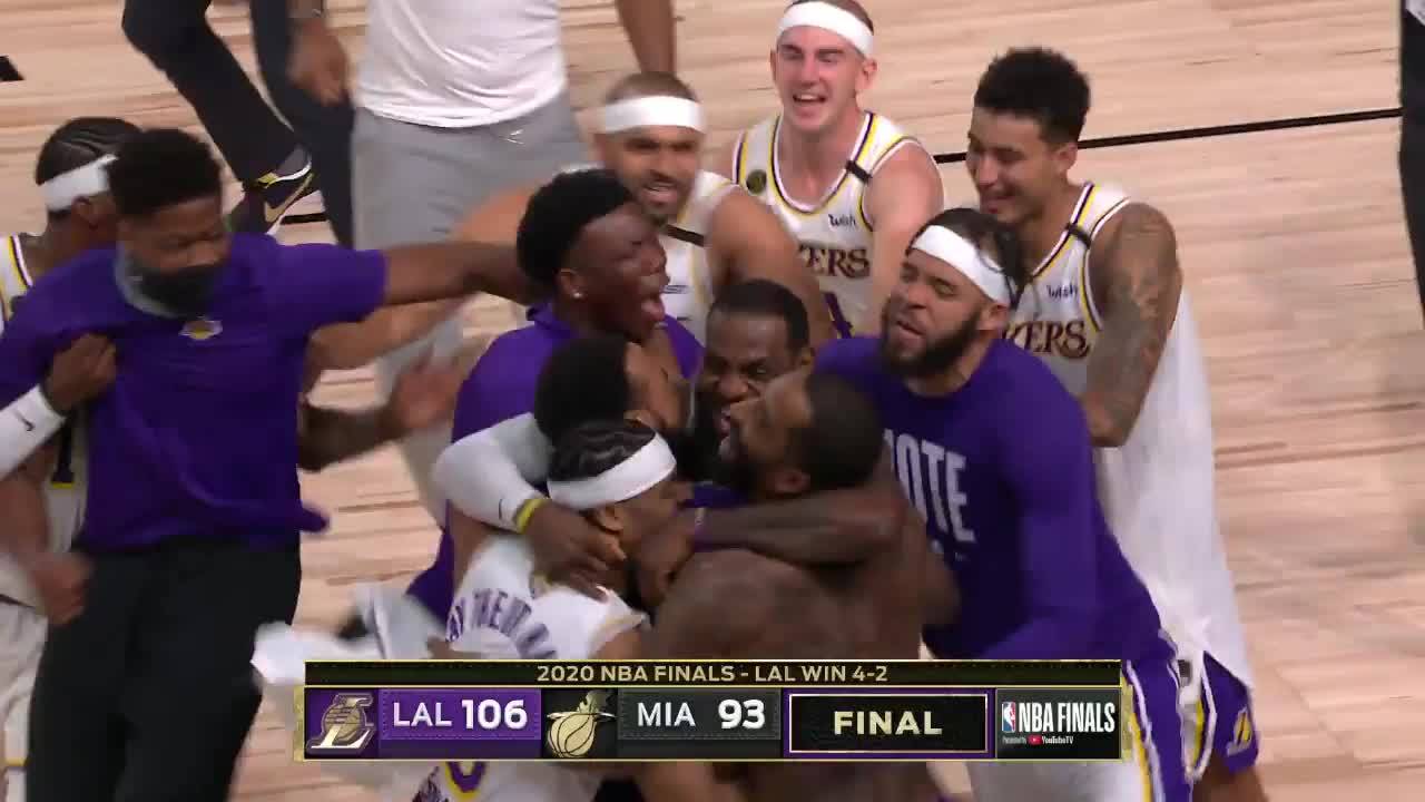 终场哨声响起,作为湖人队老大的詹姆斯举起双臂,走向场地中央。总决赛6场比赛,詹姆斯场均砍下29.8分11.8板8.5助攻,投篮命中率59.1%,三分命中率41.7%,真实命中率67.1%。
