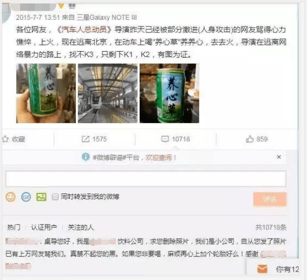 由于网友的骂声过大,导演用自己的号又一次的发了一条奇葩的微博:正坐车逃离网络,并且正在喝某个饮料降火。