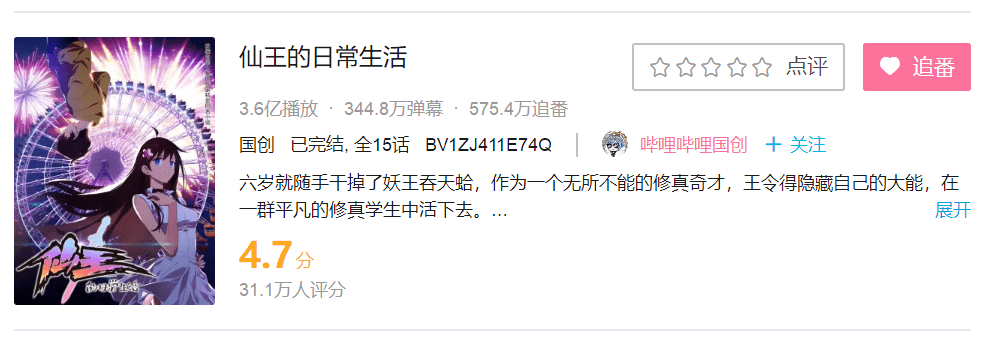 而《仙王的日常生活》在B站虽然有3.6亿的播放量,但是评分却只有4.7,比《猫妖的诱惑》还要低。