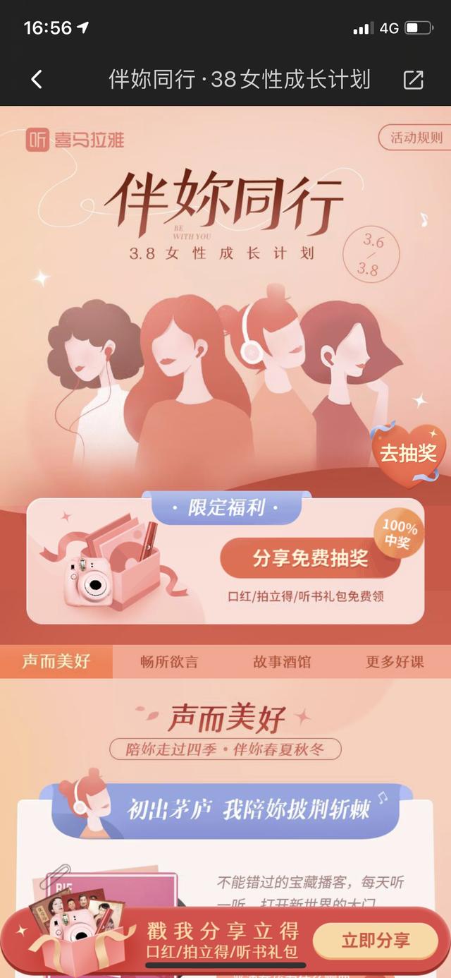 三八节之际,喜马拉雅推出"伴妳同行·女性成长计划"特别活动,与平台的女性主播一起发声,并精选优质内容助力女性成长。用户登录喜马拉雅App搜索"38节"可直达活动会场。