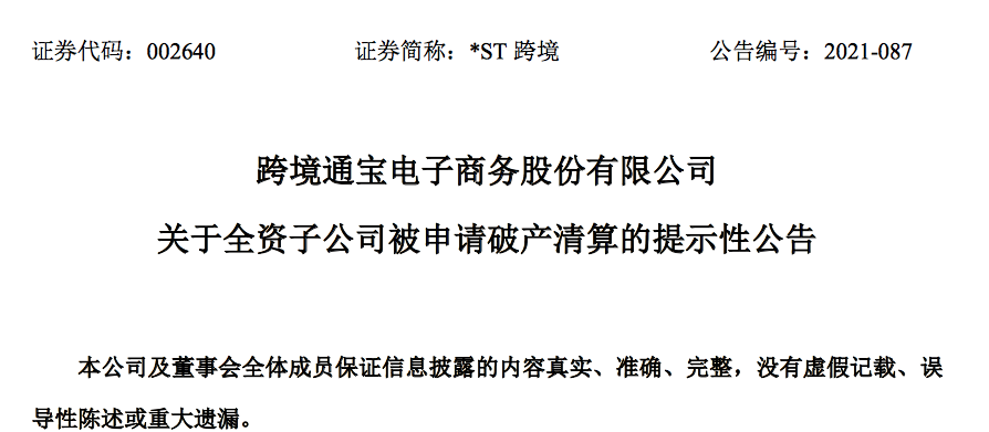 跨境通发布关于环球易购被申请破产清算的提示性公告。跨境通全资子公司深圳市环球易购电子商务有限公司近日收到广东省深圳市中级人民法院送达的(2021)粤 03 破申 380 号《通知书》,债权人中国工商银行股份有限公司深圳南山支行以深圳环球不能清偿到期债务、明显缺乏清偿能力为由,向深圳中院申请对深圳环球进行破产清算。
