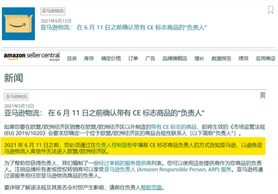 2021年7月16日,新的欧盟商品安全法规(称为《市场监管法规 (EU) 2019/1020》)即将生效。这项新法规要求带有 CE 标志的商品(除医疗器械、民用爆炸物以及某些升降机和索道装置外)需要具有位于欧盟境内的人员作为商品合规性联系人(下称"负责人")。卖家需要在商品或其包装、包裹或随附文件中显示负责人的联系信息。2021年6月11日之前,您必须上传欧盟负责人信息,以避免FBA入库货件无法进入欧盟2021年7月16日之后,在欧盟销售带有CE 标志的商品但没有欧盟负责人属于违法行为。