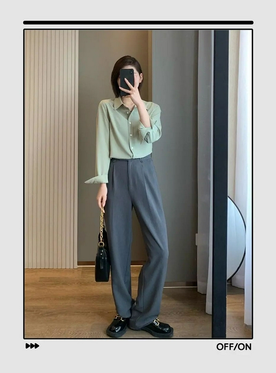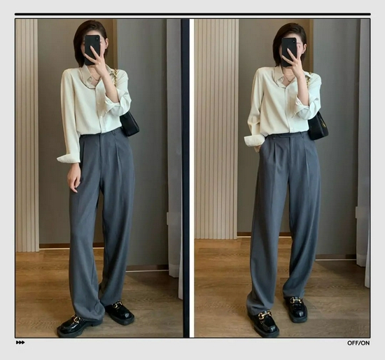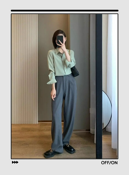 纯色衬衫低调简约搭配西装面料的阔腿裤,简直就是通勤利器,干练利落的形象可让你显得更加可靠。阔腿裤的裤腿盖住鞋面的做法,却能穿出"全是腿"的效果来。