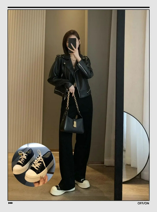 身高不是特别高的女生可以像我这样,穿一双厚底的帆布鞋,显高的效果还是很不错的,搭配皮衣也不会感觉太突兀。