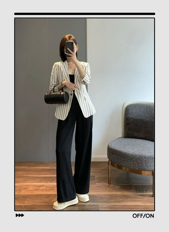 纯色西装职场范是不是太重了,我最近迷上了这种条纹西装,它是有收腰设计的,可以把你的曲线完美地展现出来。