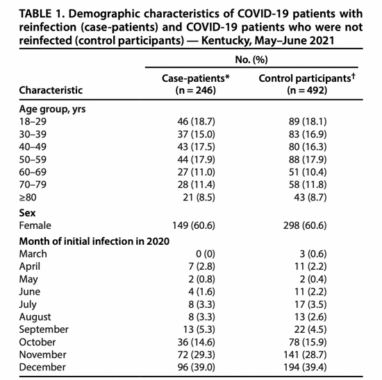 研究采用的是病例对照手法,选取了在2020年发生过感染的病例,然后按照性别、年龄、感染周期等因素,将样本分为可供对照的两组——一组在2021年5月1日至6月30日发生新冠病毒再感染,另一组则未感染。两组样本的基线数据如下。