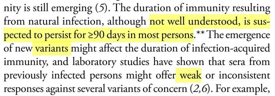 在报告的讨论部分,作者们提到了自然感染产生的抗体以及免疫机制尚未被完全研究透彻,在众多关于自然感染获得的免疫效果的数据中,这份报告选择了大于90天这个结论作为参考意见。