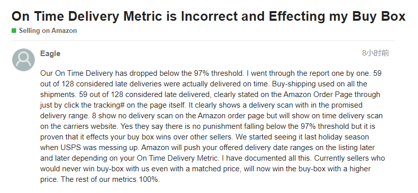 据有关卖家反映:自己店铺的OTDR最近被降到了97%以下,而在亚马逊记录的128次延迟交货中有59笔订单实际上是按时交货的,在亚马逊的订单页面内能够清楚地看到产品是在承诺的日期范围内送达的。