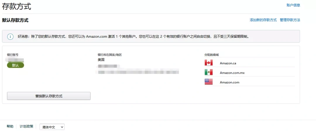近期亚马逊的后台出现了一个消息提示,现在在后台的收款账户页面中,卖家可以额外添加一个银行卡作为收款账户。