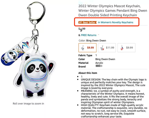 在亚马逊美国独立站,"冰墩墩"周边产品同样火爆,一款售价9.99-11.99美金的冰墩墩钥匙扣,登上了亚马逊热销榜单小类的Best Seller。