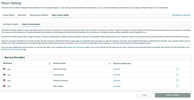 退货服务提供商计划(RP)由经过亚马逊审核的服务提供商组成,而且亚马逊已经启用了一些价格有竞争力,能提供各种服务,同意服务级别协议(SLA),并满足典型的卖家需求的提供商,他们专精于退货管理流程,可以代表您处理退货流程。