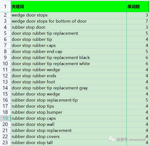 首先,我们拿door stopper用程序进行下拉框前中后缀拓词,可以得到这样的结果,下图是部分截图,一共是3000个左右拓展词,可以看到是往前面,中间,后面都可以拓出包含door和stopper的关键词出来的,这就是广泛匹配有可能跑出来的词,是亚马逊内部词库