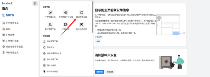 点击"创建目录",目前 FB 目录主要是针对电商、旅游、房地产、汽车 → → 点"下一步"