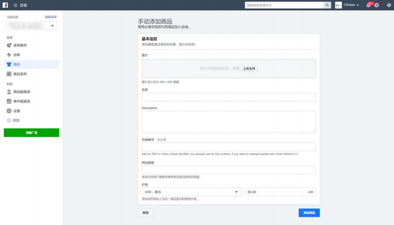 目录建立好后,进入目录 → → 点击"商品数据源"来上传商品→ → 点击"添加商品"