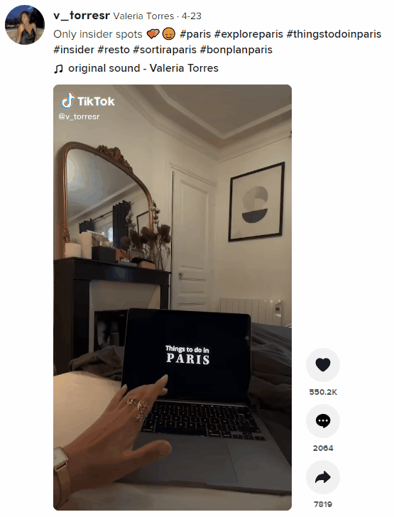 TikTok用户使用他们的笔记本电脑,假装播放和暂停他们最近旅行中的一个片段。然后随着"Original Sound by Valeria Torres"的节拍,播放他们旅游时的美丽片段。