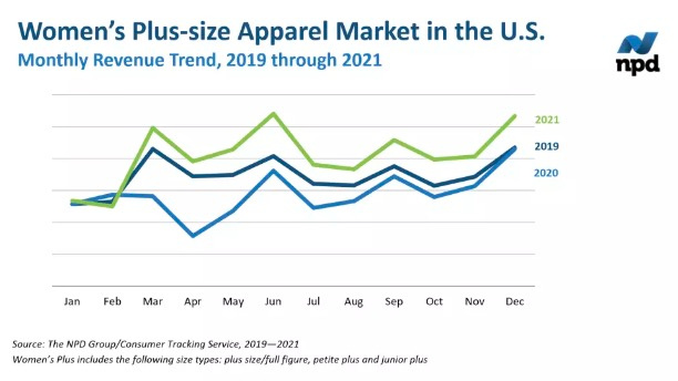 根据NPD集团最新数据,与2019年相比,2021年美国女性大码服装的销售收入增长了18%,其余女性市场上消费者支出的三倍多。自2019年以来,美国大码女装的收入持续增长,涵盖所有年龄段、人口统计和家庭收入。