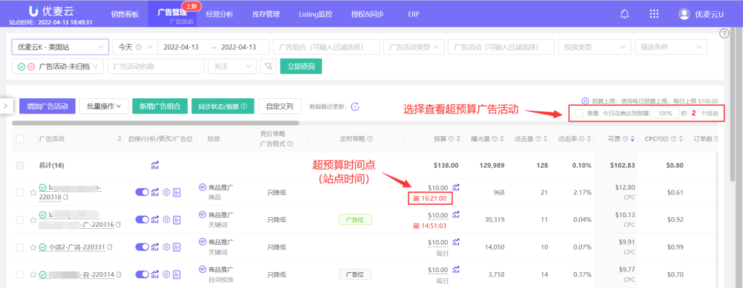 打开优麦云的【广告活动】功能,选择查看今日花费达到100%的广告活动,就可以轻松筛选出店铺内所有超预算的广告活动,并能直接看到超出预算的站点时间点。