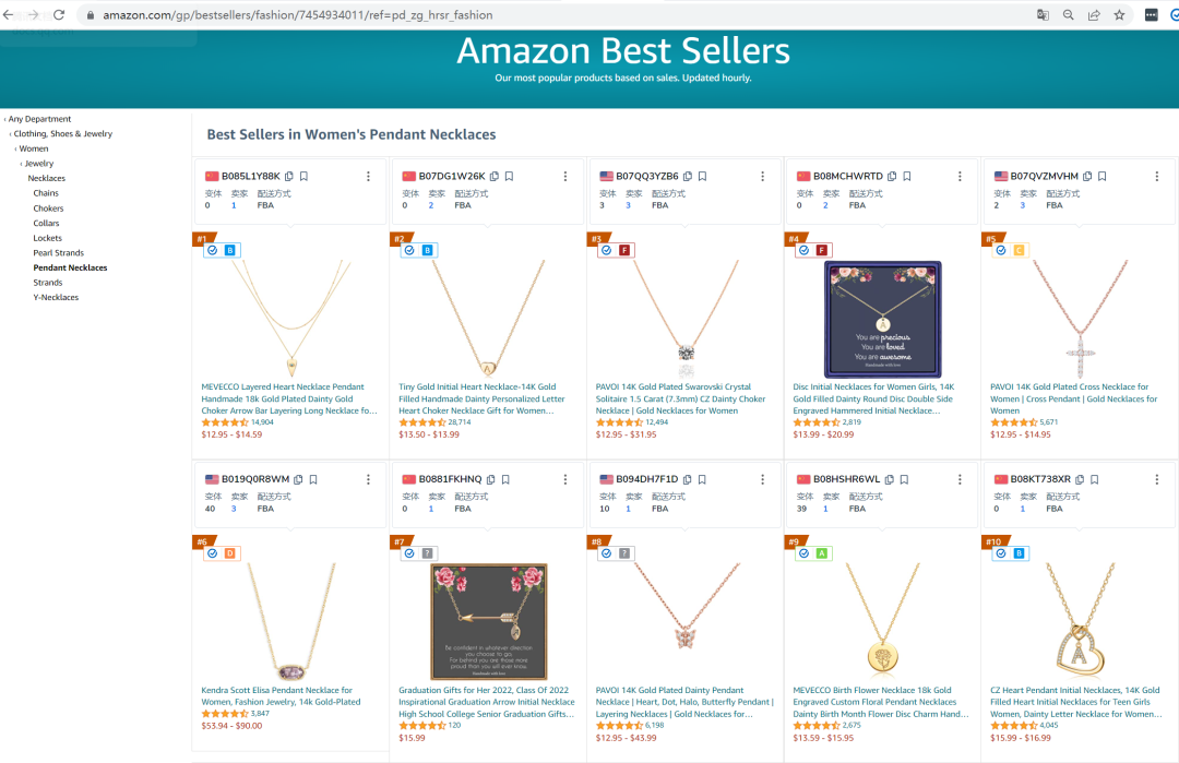 招单猫建议:小A可以打开项链类目的BSR榜单页面,寻找相关度最高的心形项链,然后使用第三方的工具如:Helium 10去反查ASIN所有变体的关键词,不仅可以得到该产品的关键词信息,还可以详细得到竞品ASIN中的Amazon's Choice的关键词排名、自然排名、广告排名分布情况!