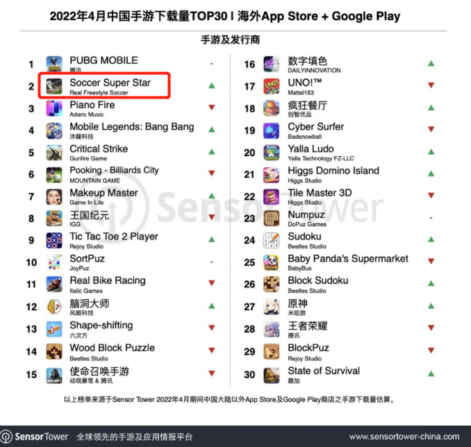 近日,SensorTower 发布了 2022 年 4 月出海手游榜单。其中下载榜第 2 名的产品引起了我们的注意。无论是产品名称还是发行账号,都不在大家所熟知的范围内。同时罗斯基查询了该游戏《Soccer Super Star》的全球下载数据,截至目前已经超 1.4 亿次。