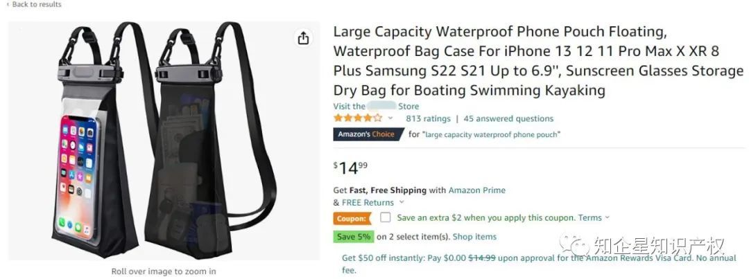 杜绝专利侵权风险,为您的产品保驾护航!手机防水袋是夏季水上必备品,不管是漂流还是游泳都会用到,季节性非常强,一旦遇到侵权问题,损失也是极大。今天分享一款手机防水袋,它是美亚站的Amazon'sChoice,售价14.99美金,留评832颗星。