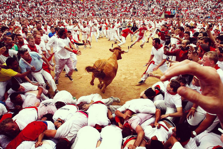 节庆的第一天,由市政厅广场发射火箭炮揭开序幕。在接下来的7天7夜里,会举办各种庆典活动,包括音乐、文艺、露天舞会等等。人们会身着传统的白色衣裤,挥舞着红色手绢,体验在愤怒的公牛前奔跑逃命的刺激。