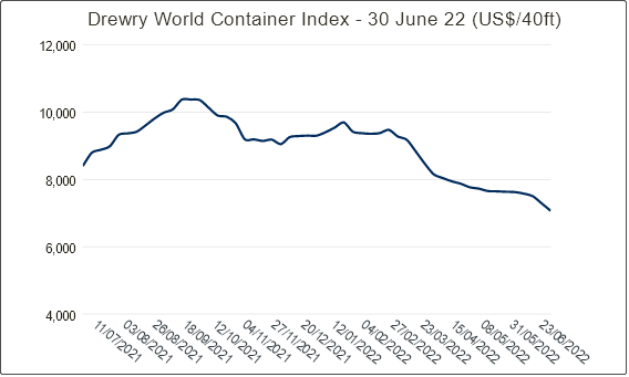 德鲁里世界集装箱指数(WCI)已连续21周下降。最新一周WCI综合指数较前一周略微下降0.7%,至6998.8美元/FEU,同比下降21%。波罗的海运价指数(FBX)全球综合指数为6414美元/FEU,较前一周下降1%。