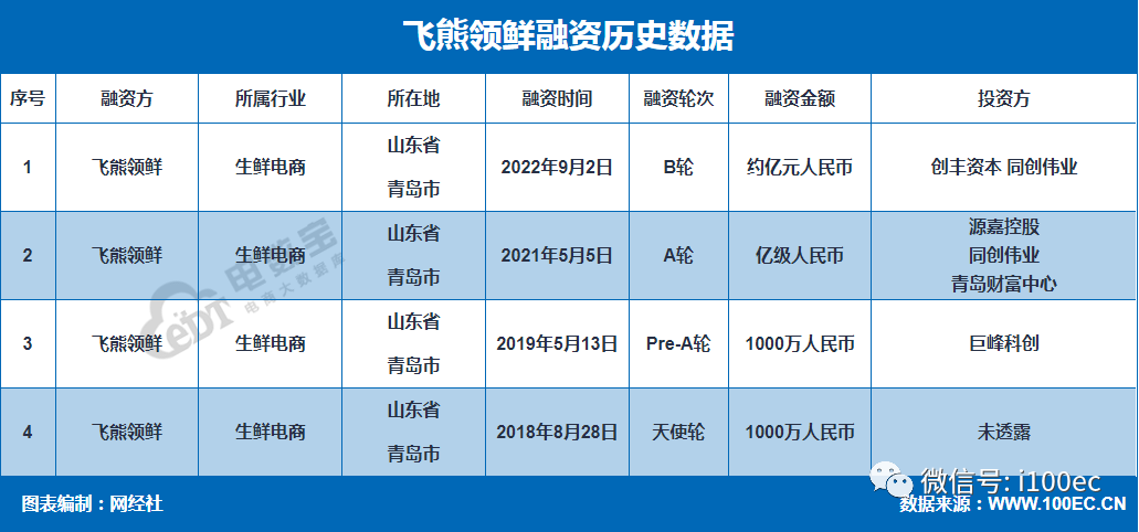 据网经社"电数宝"(DATA.100EC.CN)电商大数据监测数据显示,飞熊领鲜共完成四起融资,融资总额超2.2亿元,投资方包括国彤创丰、源嘉控股、同创伟业、青岛财富中心、巨峰科创等机构。