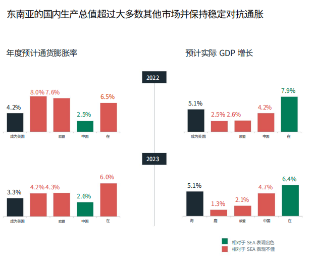 虽然全球继续面临增长的不确定性,但东南亚似乎是一个相对稳定的竞争环境。报告显示,预计 2022 年⾄ 2023 年 的东南亚实际 GDP 增⻓将超过美国、欧盟和中国等市场。明年年底,该地区预计将保持 5.1% 的预期增长率。