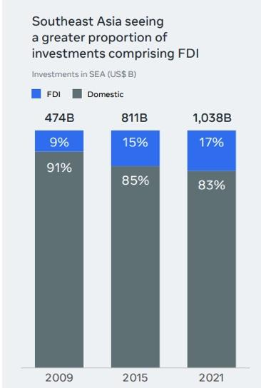 外国直接投资在 2021 年占总投资的比例更大,为 17%,而 2015 年为 15%,2009 年仅为 9%。