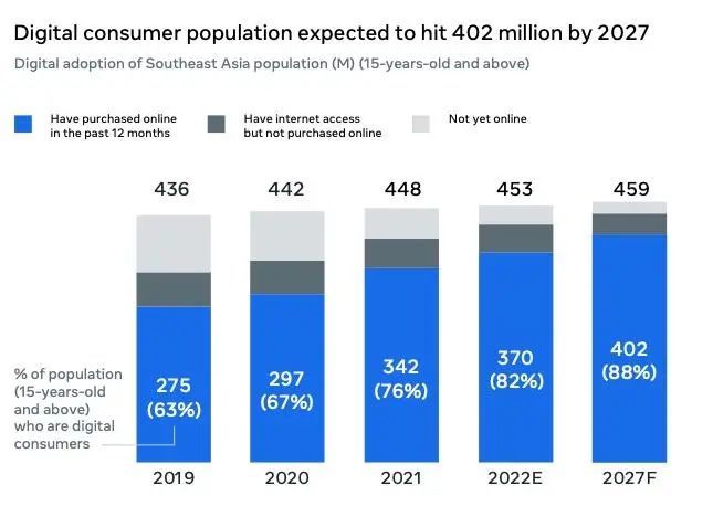 此外,东南亚的消费人口仍在稳步增长,预计到 2022 年底将达到 3.7 亿,占 15 岁及以上人口总数的 82%。预计到 2027 年,这一数字将进一步上升至 4.02 亿,到预测期结束时占 88%。