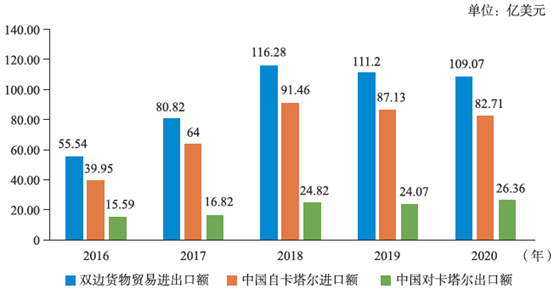 2016-2018 年,中卡双边货物贸易进出口额呈逐年增长态势,而2019 年和2020 年双边货物贸易进出口额均较上一年有所下降,但2020 年中国首次成为卡塔尔全球最大贸易伙伴,同时也成为卡塔尔第二大进口和第二大出口贸易伙伴。