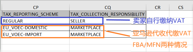 亚马逊增值税交易报告 (AVTR)和增值税计算报告 (VCR)都新增了2列:✔ CP列-纳税申报计划(Tax Reporting Scheme)✔ CQ列-征税责任方(Tax Collection Responsibility)