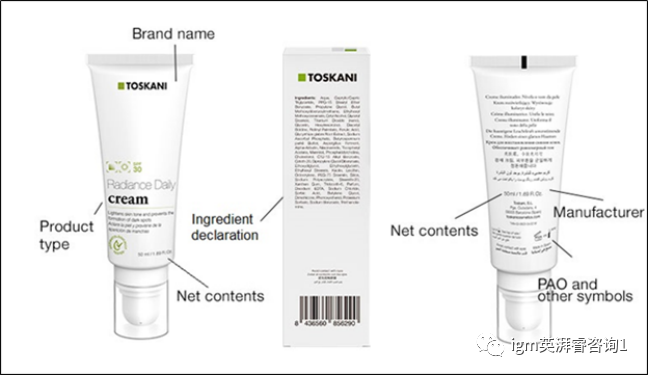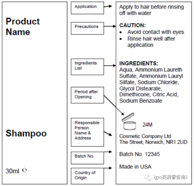 负责人的姓名和地址、生产国家、名称内容、保质期、注意事项和警告、批号、产品功能、成分清单、必须翻译成出口国的语言,以及声明必须在标签上明显、清晰、不可磨灭地出现。