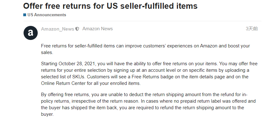 今年上半年,亚马逊美国站发布过多个关于退货政策的公告,如授权平台自动退货请求、退货标签更改等。