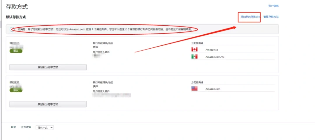 近期亚马逊的后台出现了一个消息提示,现在在后台的收款账户页面中,卖家可以额外添加一个银行卡作为收款账户。