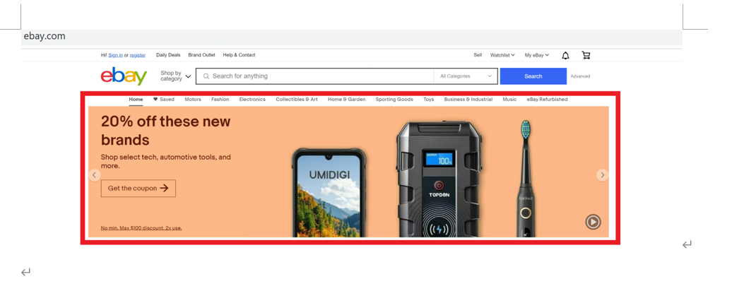 1. ebay.com 首页顶部Banner是流量巨大的黄金广告位,每天都有数以亿计的全球消费者浏览访问。在这里展示品牌、店铺及商品,这能够为卖家来吸引众多买家,为品牌的长期建设赢得先机。