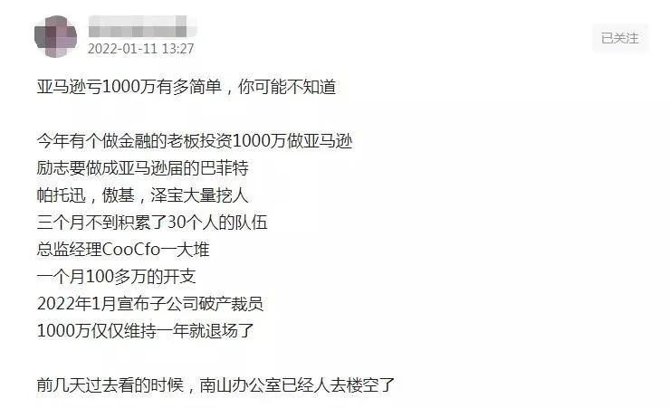 最近,跨境电商圈子里盛传着一则八卦,2021年,有一位做金融的老板投资1000万做亚马逊,并从深圳多个跨境大卖处高薪聘请人才,组成一个30多人的运营团队。结果一年时间过去,该公司就宣布破产裁员,办公室已经人去楼空。