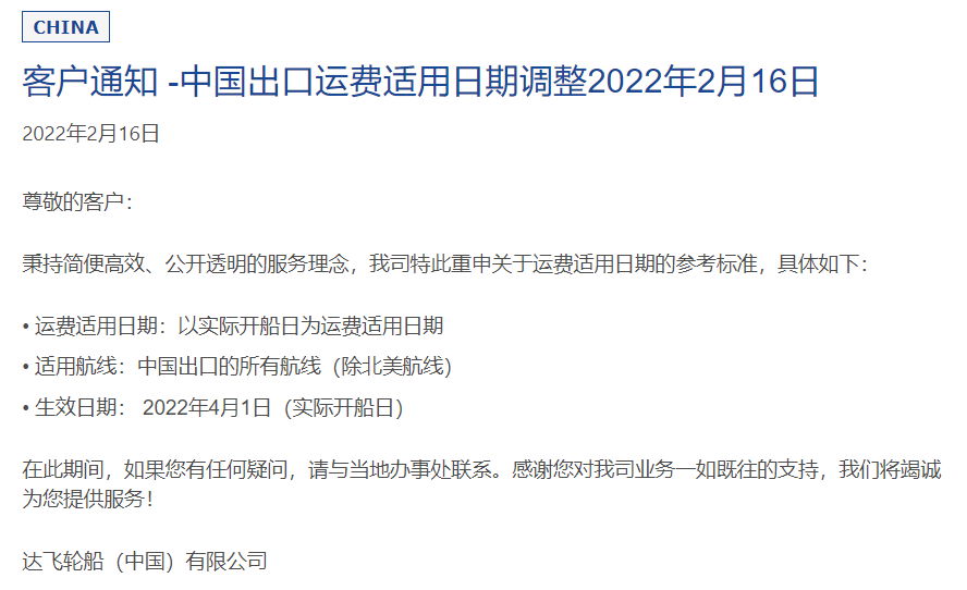 本次达飞发布公告,明确了除北美航线外的中国出口航线,其运费适用日期均指实际开船日。可以理解为:约定的价格只适用于在船舶在约定时间段内开出的情况,如超过约定时间段,则不排除价格有变动的可能。而北美航线或因众所周知的拥堵和船期紊乱问题,暂未被划入此列。
