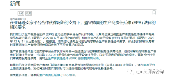 根据亚马逊最新通知,德国有关商品包装的要求需要在 2022 年 6 月 30 日之前合规;有关电气和电子设备 (EEE) 商品的要求需要在 2022 年 12 月 31 日之前合规。如果您无法向亚马逊证明您符合德国生产者责任延伸要求,那么亚马逊将有义务暂时停售卖家在生产者责任延伸商品分类下不符合要求的商品。
