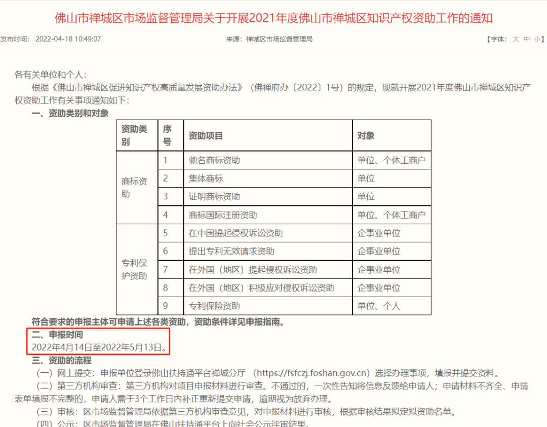 4.公示(5个工作日):区市场监督管理局在佛山扶持通平台上向社会公示评审结果。