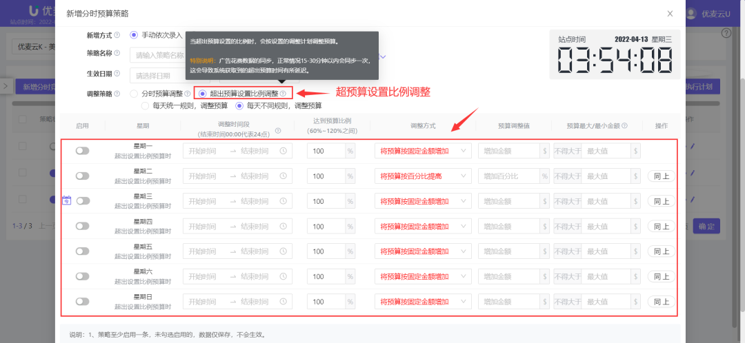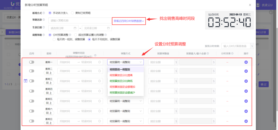 此时,我们可以通过设置分时预算,在销售高峰期调高预算,如果超预算,可再次调高预算,抓牢高峰期的流量和转化;在销售低迷期降低预算,减少无效花费。