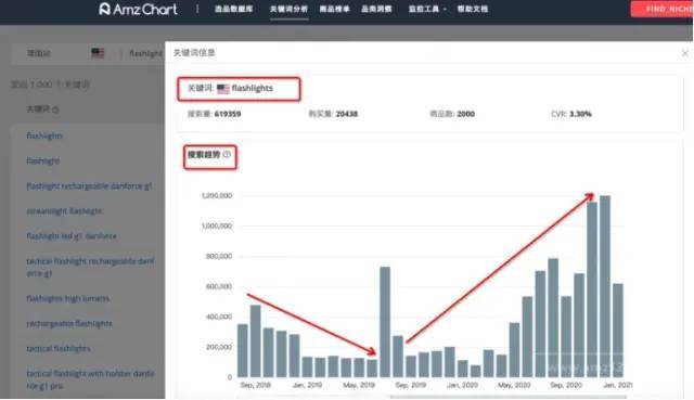 在关键词分析导航栏输入产品的ASIN码,可以查询到产品信息,点击查询到的关键词可以看到产品的搜索趋势,大部分工具都具备这个功能。