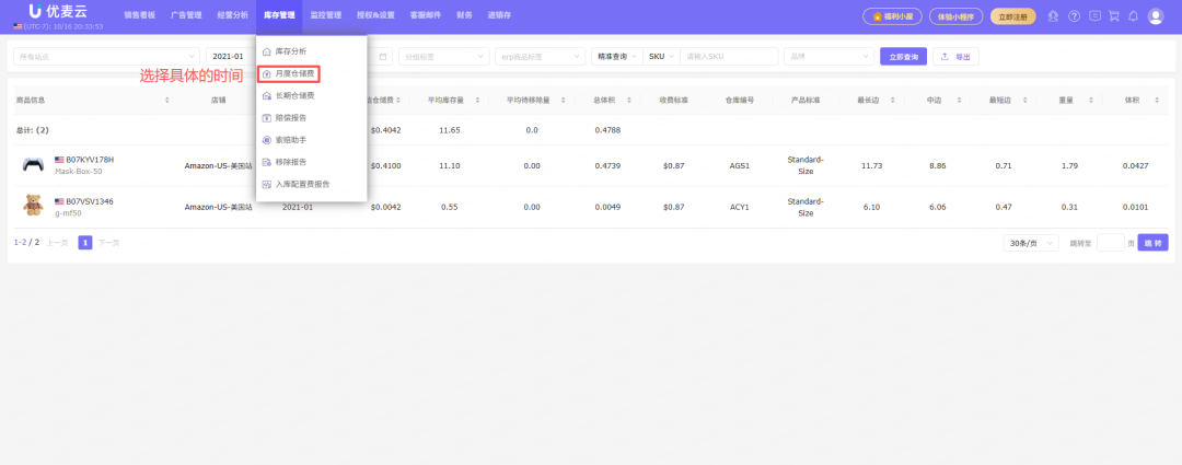 这个"日均库存体积"怎么来?我习惯用优麦云。打开【月度仓储费功能】,直接看9月份的数据。里面有个"总体积",用这个数除以30(9月天数),就是你9月份的日均库存体积了。这个数字,是我们一切计算的基石,先把它记下来。