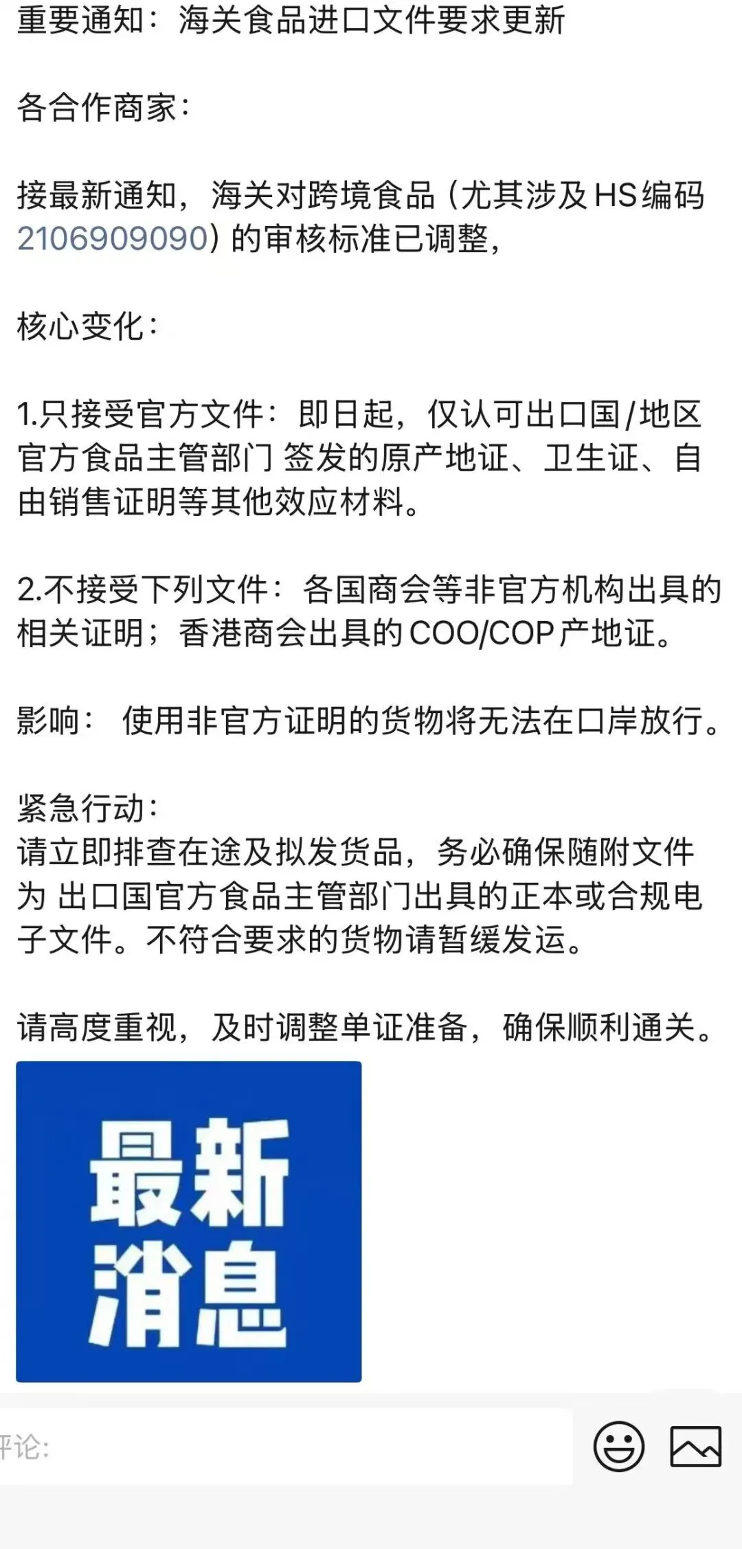 我们简单分析下:整个2025年海关部门针对跨境食品进口推出审核标准重大调整一直没有停过,总结为一个字"严",明确对跨境食品(尤其涉及HS编码2106909090项下商品)的进口文件要求实施严格规范,核心聚焦于进口文件的官方权威性认定。这一政策调整并非孤立的监管举措,而是全球跨境贸易合规化趋势的重要体现,其影响力已穿透跨境进口行业的供应链、运营模式与成本结构,从核心文件要求的变更延伸至行业竞争格局的重塑,各类跨境进口商家需深刻洞察政策本质与行业影响,构建系统性应对方案以保障业务可持续发展。